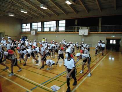 縦割り班のいつものペアで、準備運動後、「握力」「上体起こし」「長座体前屈」「反復横跳び」にチャレンジします。