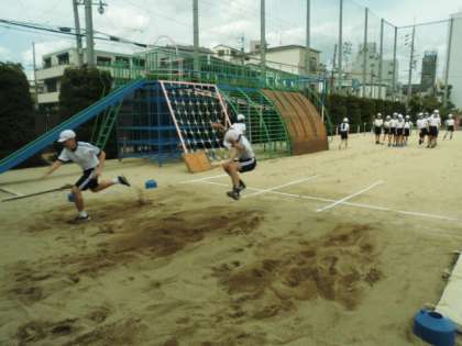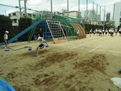 6年生が砂場で体育「走り幅跳び」の学習をしていました。