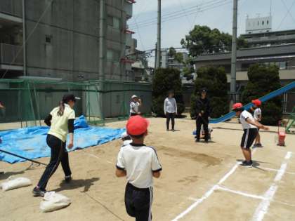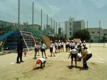 5年生が運動場で、ソフトボール投げと立ち幅跳びの測定をしていました。