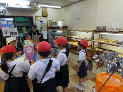 今回の町たんけんでは、お寿司屋さん、服屋さん、酒屋さん、花屋さん、米屋さん、八百屋さん、薬屋さん、和菓子屋さん、パン屋さんなどの10店舗の皆様にご協力をいただきました。