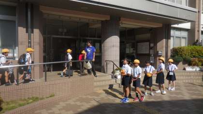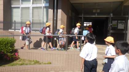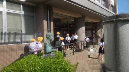 今週は、あいさつ週間ということで、担当の4・5年生児童が集団登校後に玄関であいさつの声をかけています。担当の6年生児童は、校内の2・3階廊下であいさつをしています。