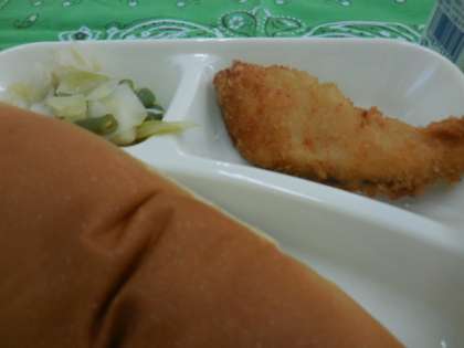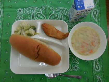 献立は、サーモンフライ、豆乳スープ、キャベツと三度豆のサラダ、パン、牛乳でした。