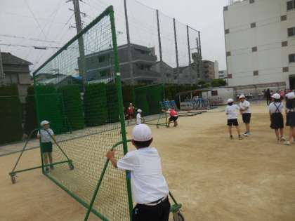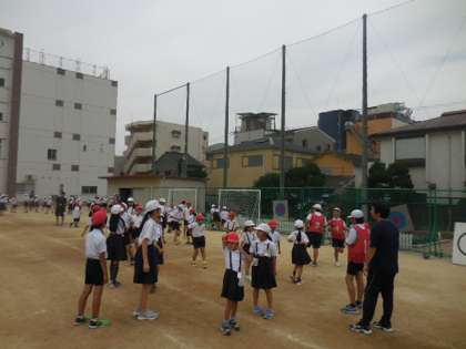 運動の時間が終わると高学年児童のリードで整理運動をして、運動委員会児童が後片付けをします。