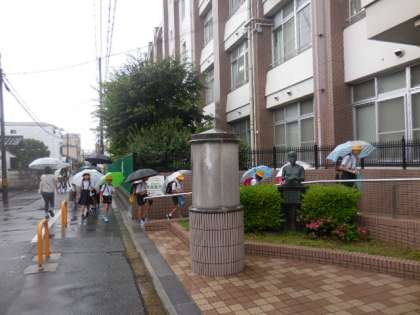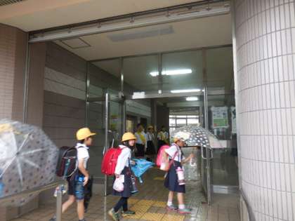 あいにくの雨で、あいさつ運動担当の子どもたちは玄関内であいさつをしていました。