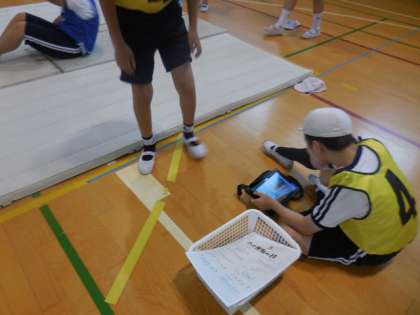 タブレット端末で、互いのチームを撮り合って、できばえを確かめ、修正していきます。