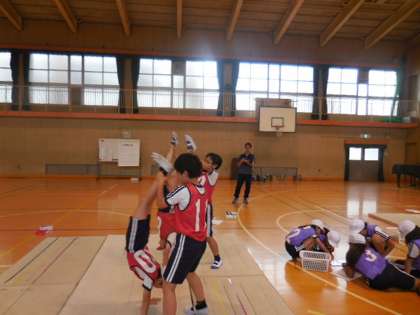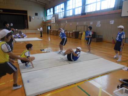 チームに分かれて、シンクロマット(チームでマット運動を組み合わせてする集団演技)にチャレンジしています。