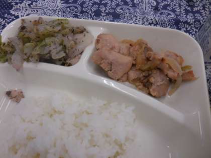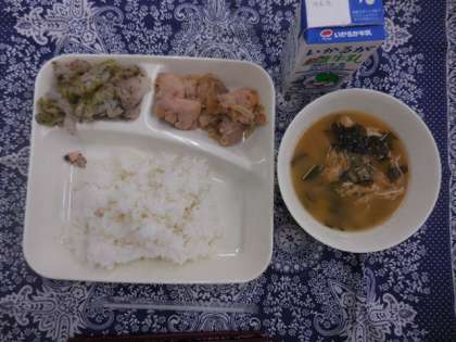 献立は、鶏肉の甘辛焼き、みそ汁、キャベツの赤ジソあえ、ごはん、牛乳でした。