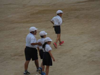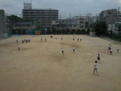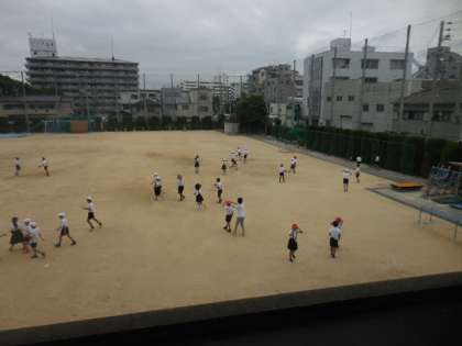 1時間目終わりの休み時間に運動場で、転入してきた児童と一緒に4年1組の子どもたちがオニゴッコ遊びをしていました。