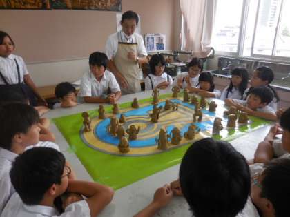 古墳の図の上に全員の埴輪を並べて、近つ飛鳥の講師の先生から子どもたちが作った埴輪の講評をしていただきました。