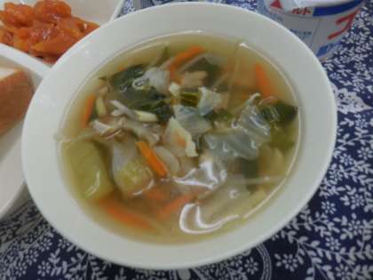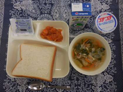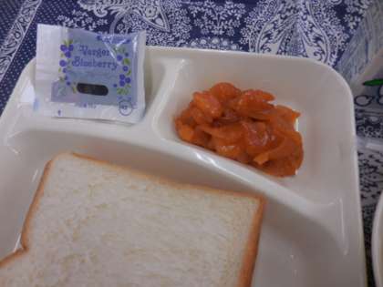 献立は、えびのチリソース、中華スープ、ヨーグルト、ブルーベリージャム、食パン、牛乳でした。