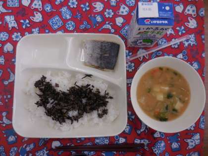 献立は、さごしのしおやき、みそ汁、牛ひじきそぼろ、ごはん、牛乳でした。