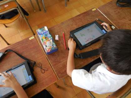 担任が地図記号の問題をタブレット端末から各子どもたちのタブレット端末に送信します。
