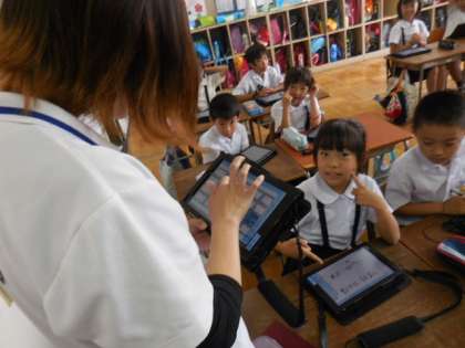 子どもたちが地図記号の問題をタブレット端末に記入すると担任のタブレット端末に各児の回答が送られてきます。