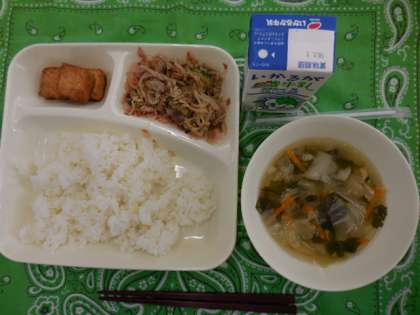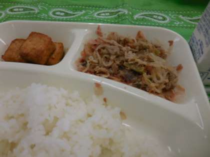 献立は、ゴーヤチャンプルー、すまし汁、厚揚げのしょうが醤油かけ、ごはん、牛乳でした。