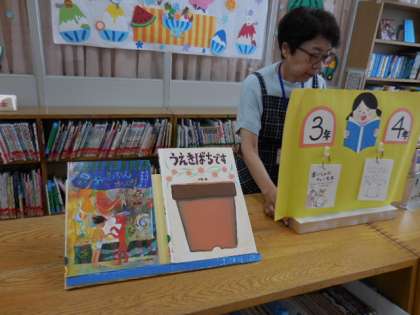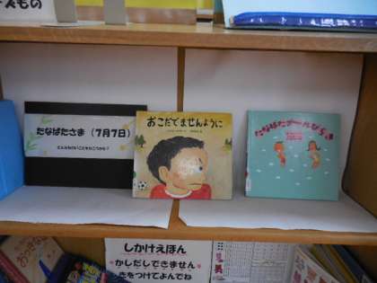 子どもたちが、いろいろな本に出会い、手に取ってくれるように七夕にちなんだ本のコーナーや各学年に応じた本の紹介などを図書館補助員、図書館ボランティアの皆さんにしていただいてます。
