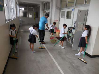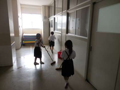 それぞれの教室はもちろんのこと廊下、階段、図書スペースなど分担してせっせと掃除をしています。