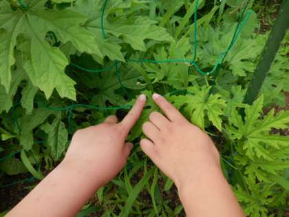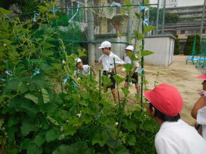 教室で、植物の生育についての学習と観察のポイントを確認してからひょうたんとゴーヤの観察に出かけました。