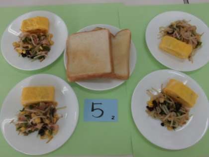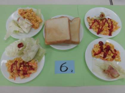 「短時間に作れる」、「栄養バランスの良い」朝食の献立を班で考え、実習しました。