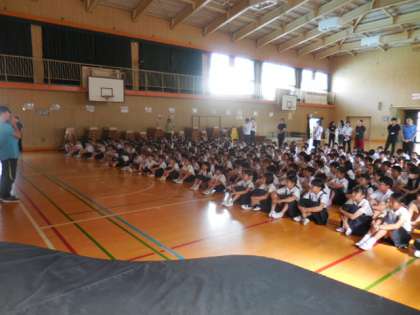 クマゼミの鳴く声が聞こえる朝、児童朝会を行いました。
