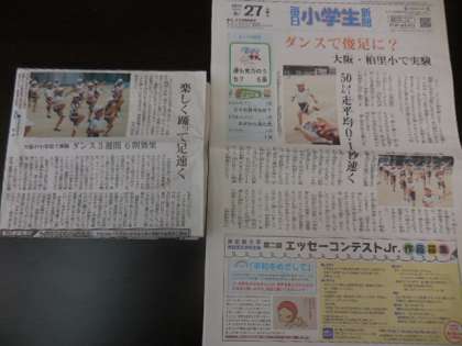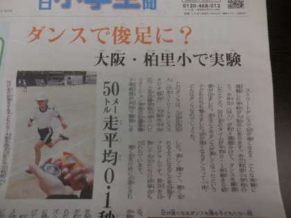 6月1日には、毎日新聞朝刊に「足が速くなるダンス」の柏里小学校での取り組みが紹介されていました。そして、今日、6月27日発行の毎日小学生新聞が、学校に届けられました。一面に「ダンスで俊足に? 大阪柏里小で実験」というタイトルで紹介されていました。「足が速くなるダンス」の取り組みの成果や分析がされていました。子どもたちの頑張った様子も紹介されていて、とてもうれしくなりました。