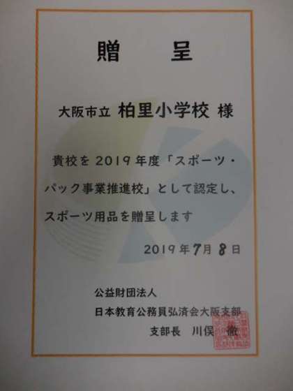 公益財団法人 日本教育公務員弘済会大阪支部より、スポーツパックが贈呈されました。スポーツパックは子どもたちの体育科学習や運動、レクリエーションに活用できるよう5万円相当のスポーツ用具を選んだものです。今回応募して、当選しました。