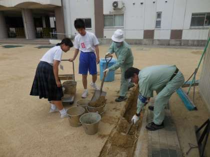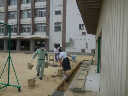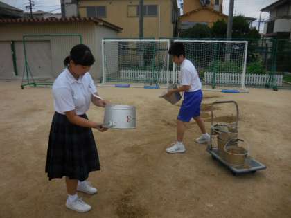 側溝にたまっていた土を管理作業員がすくってバケツに入れ、生徒が運動場のへこんだところまで運んでまきました。