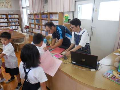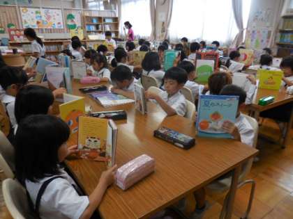 図書室で2年生が本の返却、貸し出しと自由読書をしていました。