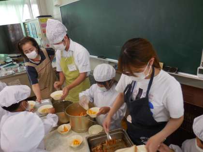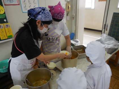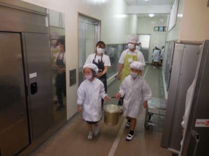 1年1組、2組に分かれて、給食当番活動の補助を体験しています。