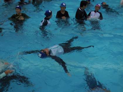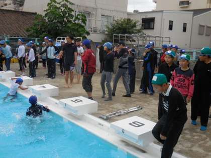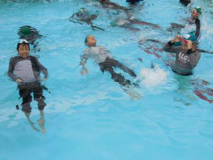 着衣のまま泳いだり、着衣で水の抵抗を感じたりしながら、どのように行動すればよいのかを体験しながらまなんでいきます。