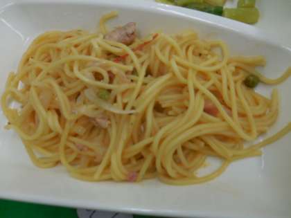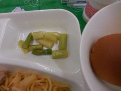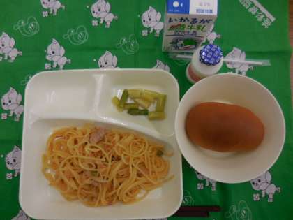 献立は、ポークトマトスパゲッティ、グリーンアスパラガスのサラダ、発酵乳、パン、牛乳でした。