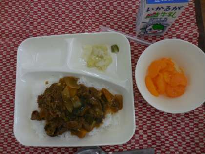 カレーライスは、月に一回給食で出てきます。今回は、夏野菜のカレーライスということで、かぼちゃ、たまねぎ、ナス、トマト、ピーマン、セロリが入っていました。とてもおいしくいただきました。