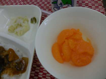 一学期最後の献立は、夏野菜のカレーライス、キャベツのサラダ、みかん(缶)、牛乳でした。