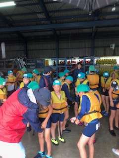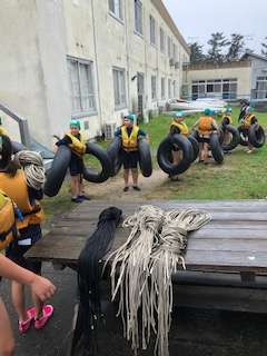 いかだづくりが始まりました。1・2、3・4、5・6、7・8班の4つのグループに分かれていかだをつくります。