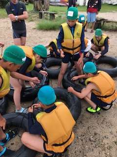 並べたタイヤをロープで結んでいます。