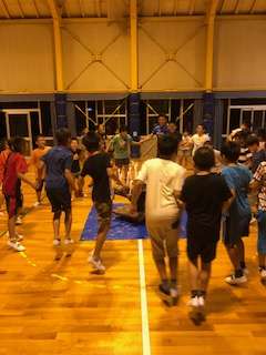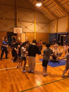 あんたがたどこさの歌に合わせて踊りました。いろいろなグループでチームワークが試されました。