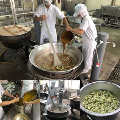 今日は子どもたちが大好きなビーフカレーライスです。調理室では、役割分担して手際よく調理を進めています。