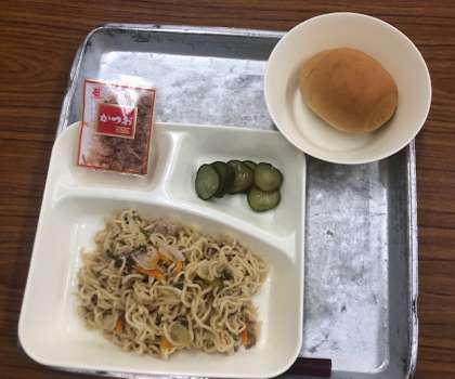本日の給食は、「わふうやきそば」「きゅうりのゆずふうみ」「牛乳」です。