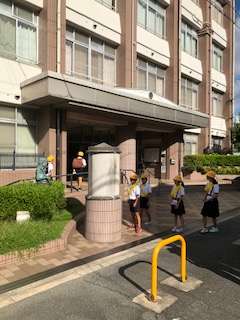 あいさつ週間2日目です。昨日の朝よりも大きな声であいさつをかわしていました。あいさつ担当児童は、用意されたタスキをかけて声をかけていました。