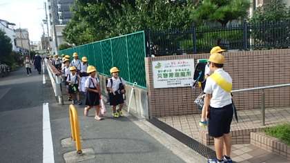子どもたちのほとんどは、集団登校の班で登校しています。