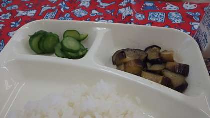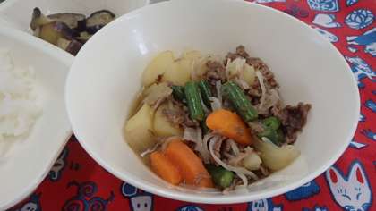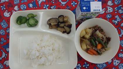 献立は、肉じゃが、焼きナスの味噌だれかけ、あっさりきゅうり、ごはん、牛乳でした。