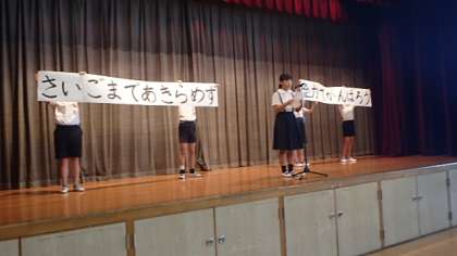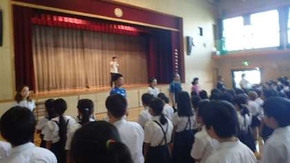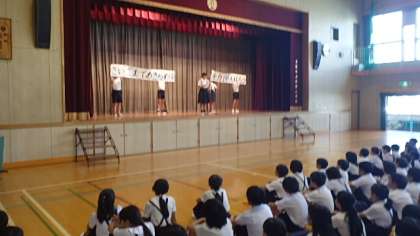 今朝の児童朝会では、校長の話の後、児童会から運動会に向けてのスローガンの発表がありました。