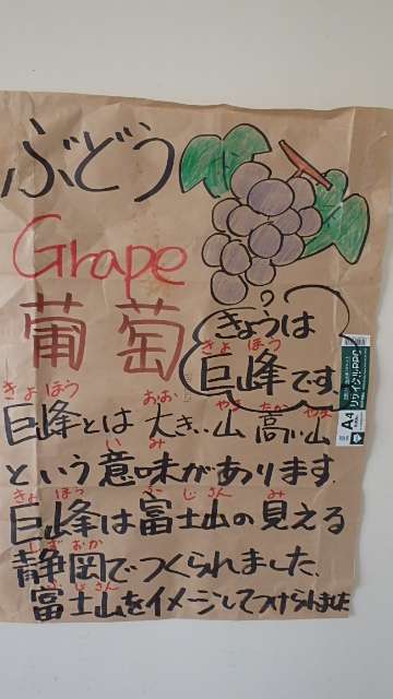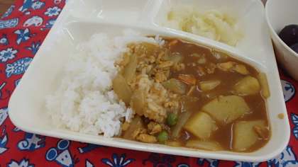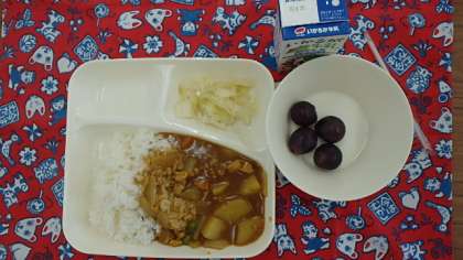 献立は、チキンカレーライス(米粉)、キャベツのピクルス、ぶどう(巨峰)、牛乳でした。