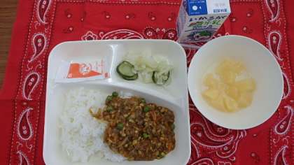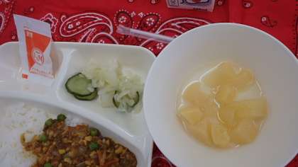 献立は、大豆入りキーマカレーライス(米粉)、グリーンサラダ、ノンエッグドレッシング、白桃(カット缶)、牛乳でした。