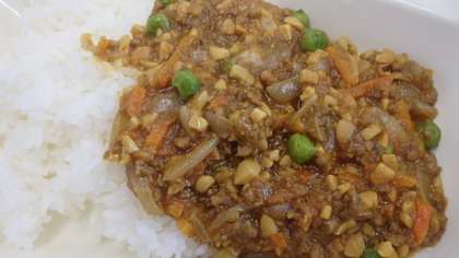 キーマカレーライスは、牛や豚のミンチ肉を使うのはもちろんですが、畑のお肉と言われる大豆(ひきわり)も使われています。より栄養価が高くなり、味がマイルドで食感もよく、とてもおいしくいただきました。