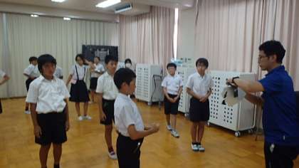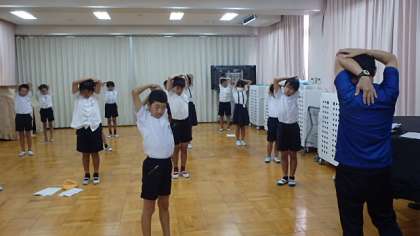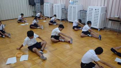 多目的室では、運動会の準備運動、整理運動担当児童が、整理運動のストレッチ体操の説明を聞いたり、動きを確かめたりしていました。