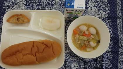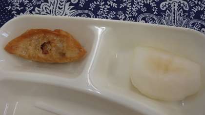 献立は、揚げ餃子、中華煮、なし(豊水)、パン、牛乳でした。