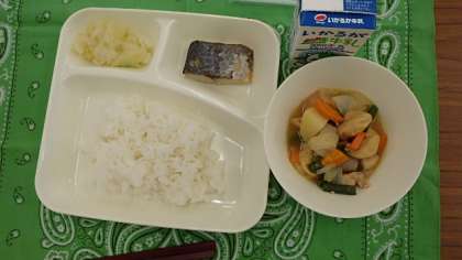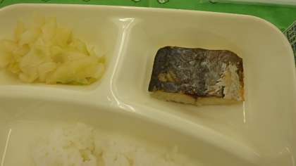 献立は、さごしの塩焼き、じゃがいもと一口がんもの煮物、キャベツのおひたし、ごはん、牛乳でした。