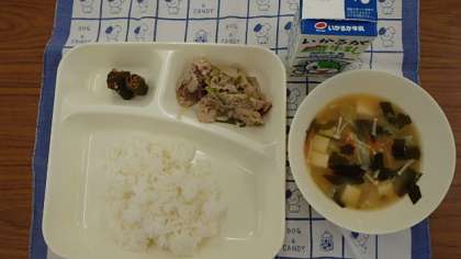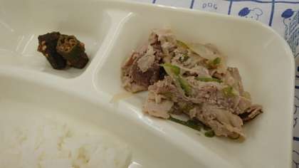 献立は、豚肉の甘辛焼き、みそ汁、オクラのおかか炒め、ごはん、牛乳でした。