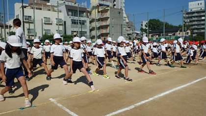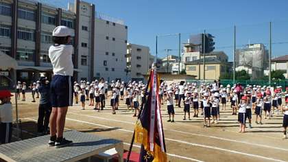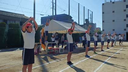 準備運動のラジオ体操、整理運動のストレッチ体操も代表児童がしっかりと体操しているので、全校児童も頑張っていました。