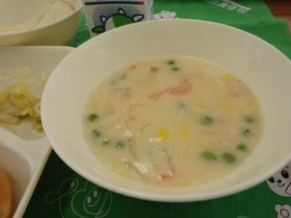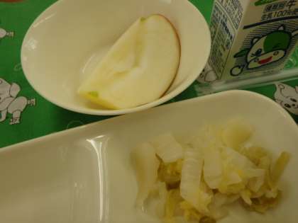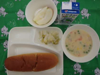 献立は、コーンクリームシチュー(米粉)、白菜のピクルス、りんご、パン、牛乳でした。